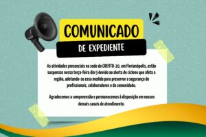 As atividades presenciais na sede do CREFITO-10, em Florianópolis, estão suspensas nessa terça-feira dia 9, devido ao alerta de ciclone que afeta a região, adotando-se essa medida para preservar a segurança de profissionais, colaboradores e da comunidade.Agradecemos a compreensão e permanecemos à disposição em nossos demais canais de atendimento.