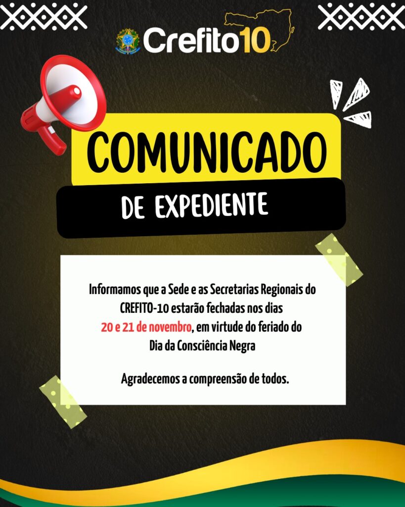 Informamos que a Sede e as Secretarias Regionais do CREFITO-10 estarão fechadas nos dias 20 e 21 de novembro, em virtude do feriado do Dia da Consciência Negra. Agradecemos a compreensão de todos.