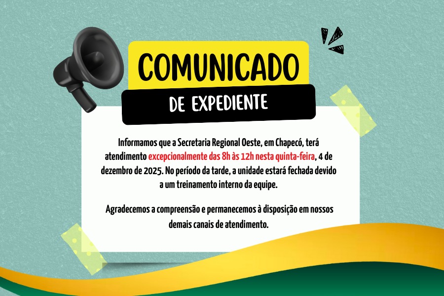Informamos que a Secretaria Regional Oeste, em Chapecó, terá atendimento excepcionalmente das 8h às 12h nesta quinta-feira, 4 de dezembro de 2025. No período da tarde, a unidade estará fechada devido a um treinamento interno da equipe.