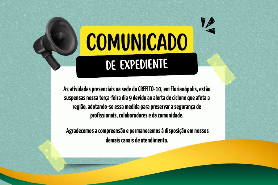 As atividades presenciais na sede do CREFITO-10, em Florianópolis, estão suspensas nessa terça-feira dia 9, devido ao alerta de ciclone que afeta a região, adotando-se essa medida para preservar a segurança de profissionais, colaboradores e da comunidade.